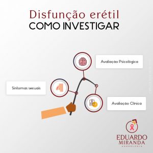 Assim como qualquer condição em Medicina a avaliação inicial da disfunção erétil envolve a realização de uma boa anamnese, exame físico da região genital e avaliação psicológica. Pode ser interessante a realização de exames de sangue para identificar sobretudo alguma alteração hormonal mais grave. Existe ainda o exame de Doppler peniano que é uma ferramenta muito importante na avaliação da saúde dos vasos sanguíneos dentro do pênis. Através do Doppler de pênis, pode-se ainda identificar se a origem do problema é prioritariamente psicológica ou se há algum defeito na circulação ou no mecanismo de ereção.